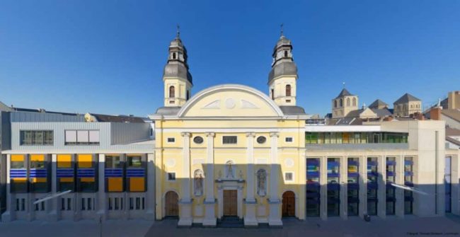 Der Neubau des Hildegardhauses mit naturwissenschaftlichen Räumen, Selbstlernzentrum und EDV-Räumen ergänzt die Straßenrandbebauung an „Unter Kranenbäumen“ und schließt gleichzeitig die vorhandene Sporthalle und die Bestandsgebäude an. Im Bestand wurden Fachbereiche zusammengefasst und Räumlichkeiten optimiert.