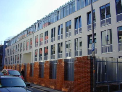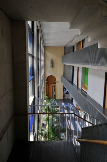 Das Cordulahaus ist in der Fassadenrhythmik der barocke Fronleichnamskirche gebaut, deren rechter Turm traditionell das Schulgelände erschließt. Der Klassentrakt beherbergt 12 Klassenräume mit moderner Medientechnik, ein Silentium sowie Nebenräume. Die Dachterrasse mit Südausrichtung und Domblick und die Halle mit dem freigestellten Kirchturm erweitern den Aufenthaltsbereich der Schülerinnen und ist gemeinschaftsbildend.